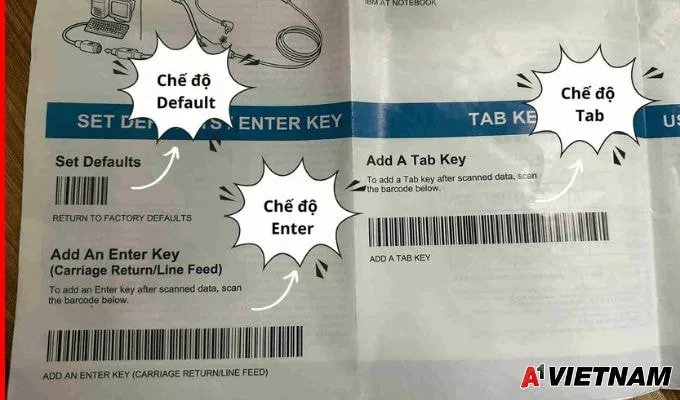 - Để cài chế độ Enter, bạn cần quét mã vạch Add An Enter Key trên giấy hướng dẫn sử dụng. Máy sẽ phát ra âm báo khi bạn cài thành công. Làm tương tự với Tab, Default.